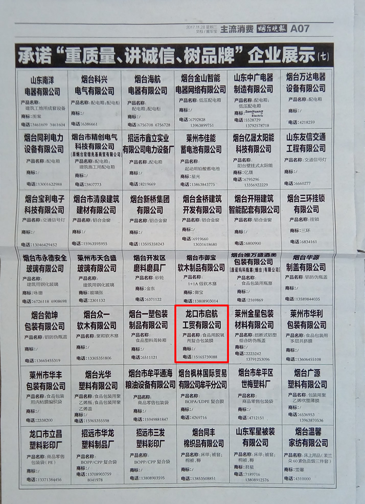 龍口市啟航工貿有限公司榮獲煙臺舉辦的承諾“重質量、講誠信、樹品牌”企業。